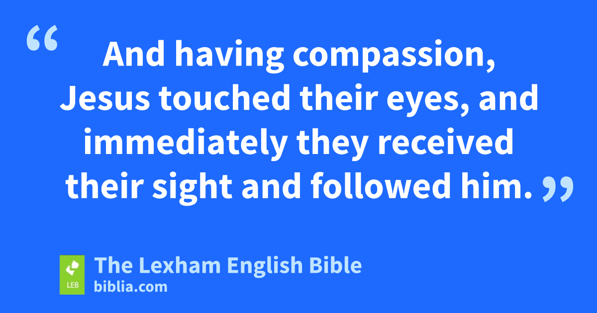 29 And as* they were going out of Jericho, a large crowd followed him. 30 And behold, there were two blind men sitting beside the road. When they* heard that Jesus was passing by, they called out, saying, “Lord, have mercy on us,g Son of David!” 31 And the crowd rebuked them so that they would be quiet. But they called out all the more, saying, “Lord, have mercy on us,h Son of David!” 32 And Jesus stopped,* called them, and said, “What do you want me to do for you?” 33 They said to him, “Lord, that our eyes be opened!” 34 And having compassion, Jesus touched their eyes, and immediately they received their sight and followed him.