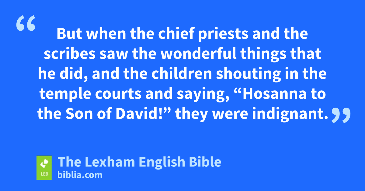 14 And the blind and the lame came up to him in the temple courts* and he healed them. 15 But when* the chief priests and the scribes saw the wonderful things that he did, and the children shouting in the temple courts* and saying, “Hosanna to the Son of David!” they were indignant. 16 And they said to him, “Do you hear what these children* are saying?” So Jesus said to them, “Yes, have you never read, ‘Out of the mouths of children and nursing babies you have prepared for yourself praise’?”f 17 And leaving them, he went outside of the city to Bethany and spent the night there.