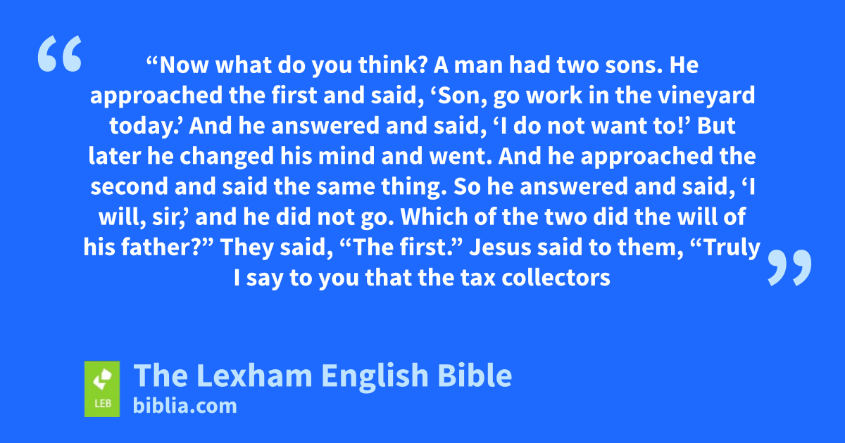 28 “Now what do you think? A man had two sons. He approachedh the first and* said, ‘Son, go work in the vineyard today.’ 29 And he answered and* said, ‘I do not want to!’ But later he changed his mind and* went. 30 And he approached the secondi and* said the same thing. So he answered and* said, ‘I will, sir,’ and he did not go. 31 Which of the two did the will of hisj father?” They said, “The first.” Jesus said to them, “Truly I say to you that the tax collectors and the prostitutes are going ahead of you into the kingdom of God! 32 For John came to you in the way of righteousness and you did not believe him, but the tax collectors and the prostitutes did believe him. And when* you saw it,* you did not even change your minds later so as to believe in him.