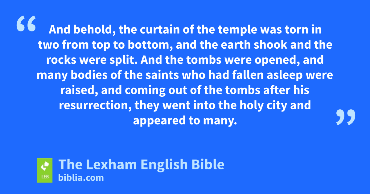 45 Now from the sixth hour, darkness came over all the land until the ninth hour. 46 And about the ninth hour Jesus cried out with a loud voice, saying, “Eli, Eli, lema sabachthani?” (that is, “My God, my God, why have you forsaken me?”)p 47 And some of those who were standing there, when they* heard it,* said, “This man is summoning Elijah!” 48 And immediately one of them ran and took a sponge and filled it* with sour wine and put it* on a reed and* gave it* to him to drink. 49 But the others said, “Leave him* alone! Let us see if Elijah is coming to save him.” 50 And Jesus cried out again with a loud voice and* gave up his* spirit. 51 And behold, the curtain of the temple was torn in two from top to bottom, and the earth shook and the rocks were split. 52 And the tombs were opened, and many bodies of the saints who had fallen asleep were raised, 53 and coming out of the tombs after his resurrection, they went into the holy city and appeared to many.