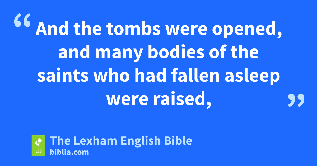 45 Now from the sixth hour, darkness came over all the land until the ninth hour. 46 And about the ninth hour Jesus cried out with a loud voice, saying, “Eli, Eli, lema sabachthani?” (that is, “My God, my God, why have you forsaken me?”)p 47 And some of those who were standing there, when they* heard it,* said, “This man is summoning Elijah!” 48 And immediately one of them ran and took a sponge and filled it* with sour wine and put it* on a reed and* gave it* to him to drink. 49 But the others said, “Leave him* alone! Let us see if Elijah is coming to save him.” 50 And Jesus cried out again with a loud voice and* gave up his* spirit. 51 And behold, the curtain of the temple was torn in two from top to bottom, and the earth shook and the rocks were split. 52 And the tombs were opened, and many bodies of the saints who had fallen asleep were raised, 53 and coming out of the tombs after his resurrection, they went into the holy city and appeared to many.