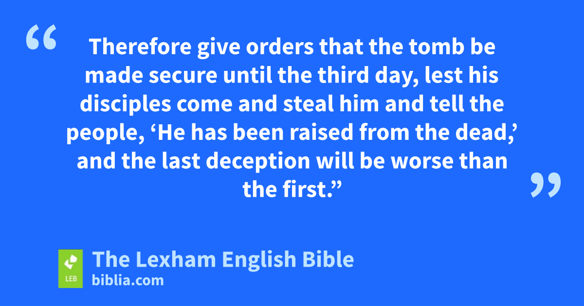 62 Now on the next day, which is after the day of preparation, the chief priests and the Pharisees assembled before Pilate, 63 saying, “Sir, we remember that while* that deceiver was still alive he said, ‘After three days I will rise.’ 64 Therefore give orders that the tomb be made secure until the third day, lest his disciples come and* steal him and tell the people, ‘He has been raised from the dead,’ and the last deception will be worse than the first.” 65 Pilate said to them, “You have a guard of soldiers. Go, make it* as secure as you know how.” 66 So they went with the guard of soldiers and* made the tomb secure by* sealing the stone.
