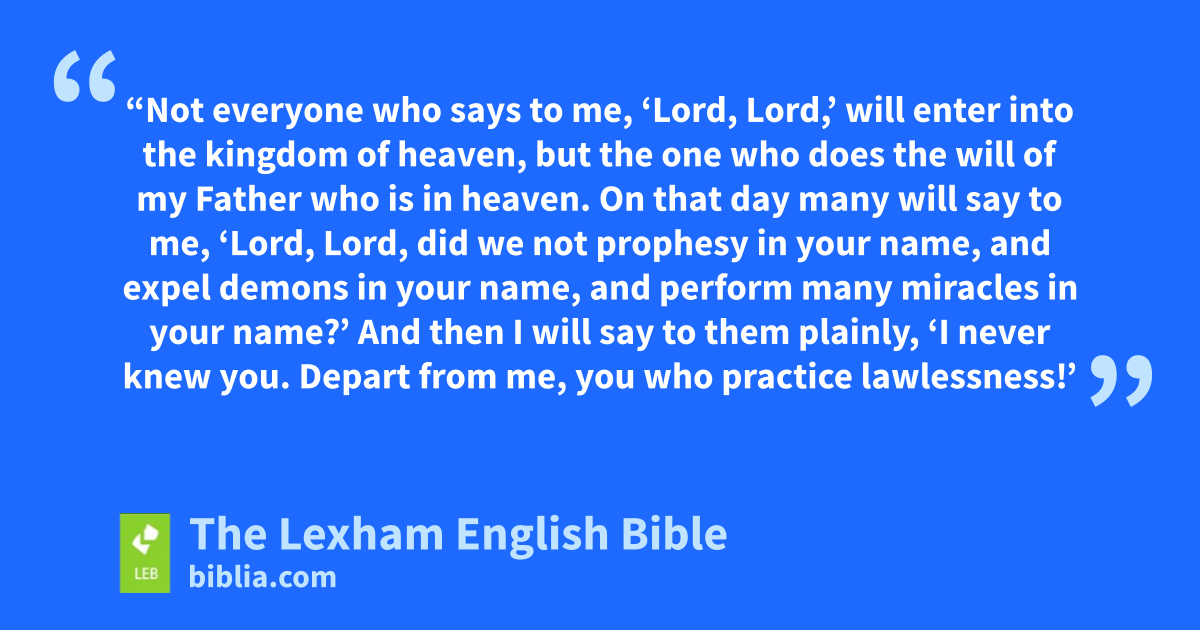 21 “Not everyone who says to me, ‘Lord, Lord,’ will enter into the kingdom of heaven, but the one who does the will of my Father who is in heaven. 22 On that day many will say to me, ‘Lord, Lord, did we not prophesy in your name, and expel demons in your name, and perform many miracles in your name?’ 23 And then ⌊I will say to them plainly⌋,c ‘I never knew you. Depart from me, you who practice lawlessness!’