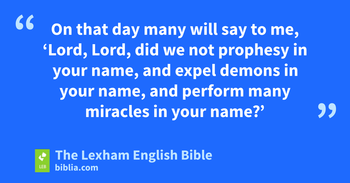 21 “Not everyone who says to me, ‘Lord, Lord,’ will enter into the kingdom of heaven, but the one who does the will of my Father who is in heaven. 22 On that day many will say to me, ‘Lord, Lord, did we not prophesy in your name, and expel demons in your name, and perform many miracles in your name?’ 23 And then ⌊I will say to them plainly⌋,c ‘I never knew you. Depart from me, you who practice lawlessness!’