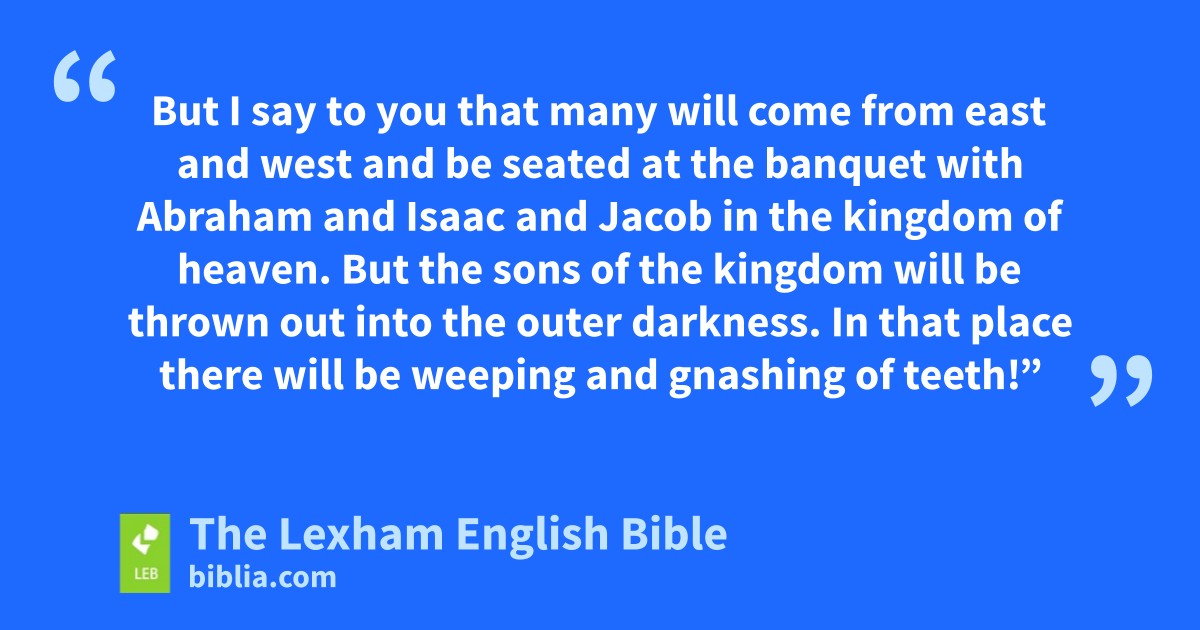 10 Now when* Jesus heard this,* he was astonished, and said to those who were following him,* “Truly I say to you, I have found such great faith with no one in Israel. 11 But I say to you that many will come from east and west and ⌊be seated at the banquet⌋d with Abraham and Isaac and Jacob in the kingdom of heaven. 12 But the sons of the kingdom will be thrown out into the outer darkness. In that place there will be weeping and gnashing of teeth!” 13 And Jesus said to the centurion, “Go, as you have believed it will be done for you.” And the slavee was healed at that hour.