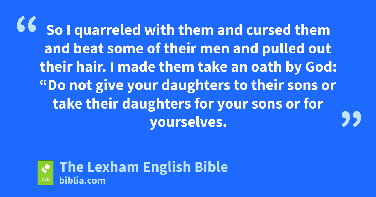 23 Also in those days I saw Jews who had married women of Ashdod, Ammon, and Moab. 24 Half of their children spoke Ashdodite and could not speak Judean, but only the tongues of other nations. 25 So I quarreled with them and cursed them and beat some of their men and pulled out their hair. I made them take an oath by God: “Do not give your daughters to their sons or take their daughters for your sons or for yourselves. 26 Did not King Solomon of Israel sin in this way? And among the many nations there was no king like him, and he was beloved by his God, and God made him king over all Israel. Yet the foreign women made even him sin. 27 Should we listen to you all and do this great evil, acting unfaithfully against our God by marrying foreign women?”