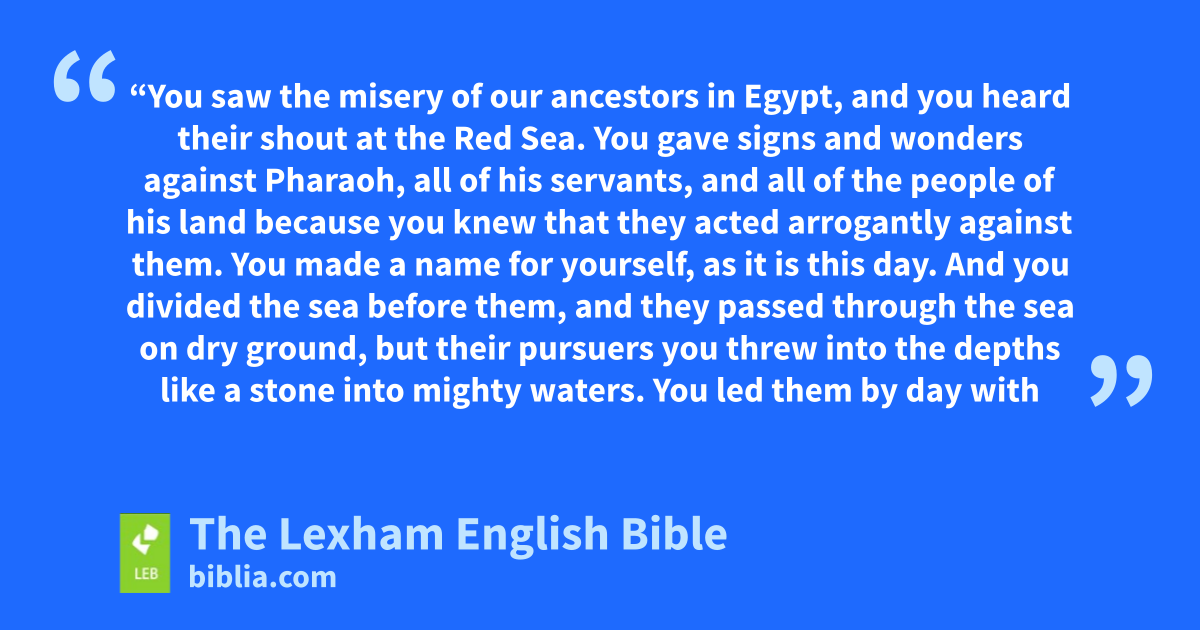 9 “You saw the misery of our ancestorsd in Egypt, and you heard their shout at the Red Sea. 10 You gave signs and wonders against Pharaoh, all of his servants, and all of the people of his land because you knew that they acted arrogantly against them. You made a name for yourself, as it is this day. 11 And you divided the sea before them, and they passed through the sea on dry ground, but their pursuers you threw into the depths like a stone into mighty waters. 12 You led them by day with a column of cloud and with a column of fire by night, to give them light on the way that they were to go. 13 Then you came down on Mount Sinai and spoke with them from heaven and gave them right judgments and true teachings, good regulations and commandments. 14 You made known your holy Sabbath to them and gave them commandments, regulations, and lawe by the hand of your servant Moses. 15 You gave them bread from heaven for their starvation, and you caused water to go out from a rock for their thirst. You told them to go in order to take into possession the land that you have sworn by your hand to give to them.