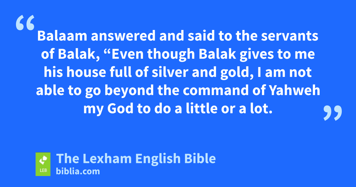 15 Balak again sent many princes, who were more honored ⌊than the former⌋.o 16 They came to Balaam and said to him, “Thus says Balak son of Zippor, ‘Please, let nothing keep you from coming to me 17 because I will surely honor you greatly, and all that you say to me I will do. Please, come; curse this people for me.’ ” 18 Balaam answered and said to the servants of Balak, “Even though Balak gives to me his house full of silver and gold, I am not able to go beyond ⌊the command of Yahweh⌋p my God to do a little or a lot. 19 And now please, ⌊you also stay here⌋q the night, and ⌊let me find out⌋r again what Yahweh will say with me.” 20 And God came to Balaam at night, and he said to him, “If the men have come to call you, get up and go with them; but only the word that I will speak to you, you will do.” 21 So Balaam got up in the morning and saddled his donkey, and he went with the princes of Moab.