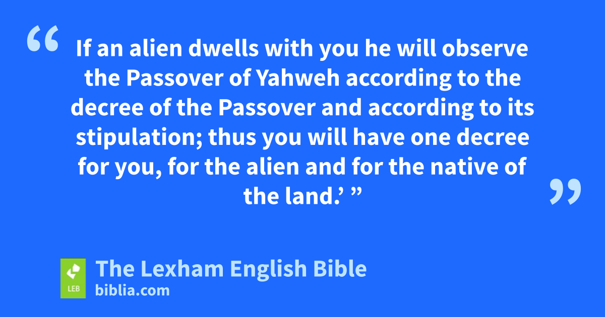 9 And Yahweh spoke to Moses, saying, 10 “Speak to the ⌊Israelites⌋,j saying, ‘Each man that is unclean ⌊by a dead person⌋k or is on a far journey, you or your ⌊descendants⌋,l he will observe the Passover of Yahweh. 11 On the second month on the fourteenth day ⌊at twilight⌋m they will observe it; they will eat it with unleavened bread and bitter plants. 12 They will leave none of it until morning, and they will not break a bone in it; they will observe it according to every decree of the Passover. 13 But the man who is clean and not on a journey, and he fails to observe the Passover, that person will be cut off from the people because he did not present the offering of Yahweh on its appointed time. That man will bear his guilt. 14 If an alien dwells with you he will observe the Passover of Yahweh according to the decree of the Passover and according to its stipulation; thus you will have one decree for you, for the alien and for the native of the land.’ ”