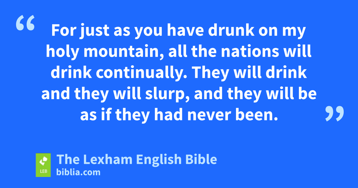 15 “For the day of Yahweh is near against all the nations! Just as you have done, it will be done to you. Your deeds will return on your own head. 16 For just as you have drunk on ⌊my holy mountain⌋,o all the nations will drink continually. They will drink and they will slurp, and they will be as if they had never been. 17 But on Mount Zion there will be an escape, and it will be holy, and the house of Jacob will take possession of their dispossessors. 18 And the house of Jacob will be a fire and the house of Joseph a flame, and the house of Esau stubble; and they will set them on fire and will consume them. And there will not be a survivor for the house of Esau,” for Yahweh has spoken.
