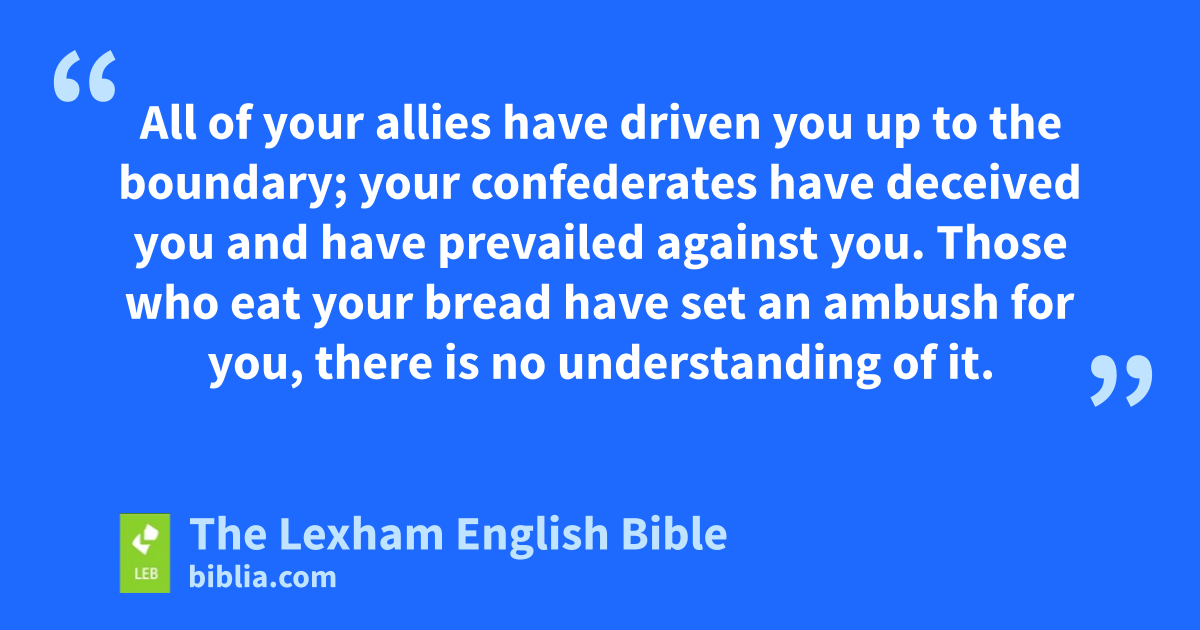 We have heard a report from Yahweh, and a messenger has been sent among the nations: “Rise up and let us rise against ita for battle.” 2 “Look, I willb make you insignificant among the nations. You will be utterly despised! 3 The pride of your heart has deceived you, you who live in the clefts of a rock, the heights of its dwelling, you who say in your heart: ‘Who can bring me down to the ground?’ 4 Even if you soar like the eagle, even if your nest is set among the stars, from there I will bring you down!” ⌊declares⌋c Yahweh: 5 “If thieves came to you, if plunderers of the night—How you have been destroyed!—would they not steal ⌊what they wanted⌋?d If grape gatherers came to you, would they not leave gleanings? 6 How Esau has been pillaged; his treasures have been ransacked! 7 All of your ⌊allies⌋e have driven you up to the boundary; your ⌊confederates⌋f have deceived you and have prevailed against you. Those who eat your bread have set an ambush for you, there is nog understanding of it.h 8 On that day,” ⌊declares⌋i Yahweh, “will I not destroy the wise men from Edom, and understanding from the mountain of Esau? 9 And your warriors will be shattered, O Teman, so that ⌊everyone⌋j from the mountain of Esau will be cut off because of the slaughter!