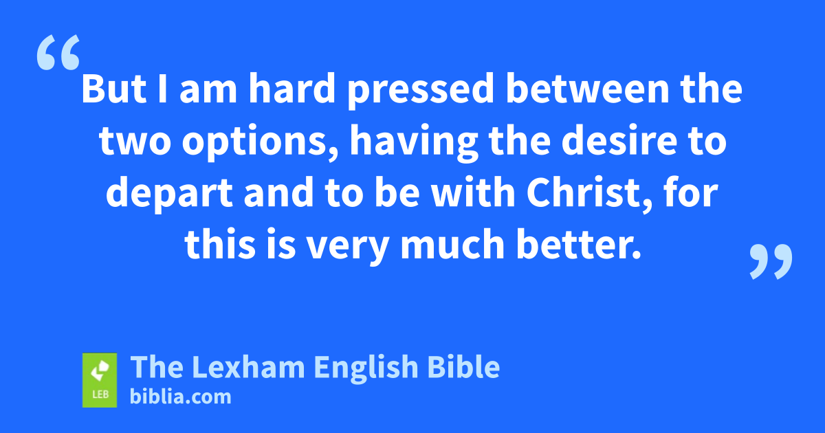 12 Now I want you to know, brothers, that ⌊my circumstances⌋c have happened instead for the progress of the gospel, 13 so that my imprisonment in Christ has become known in the whole praetoriumd and to all the rest, 14 and most of the brothers, trusting in the Lord because of my imprisonment, dare even more to speak the word without fear. 15 Some even because of envy and strife preach Christ, but some also because of good will. 16 The latter do so from love, knowing that I am appointed for the defense of the gospel. 17 The former proclaim Christ from selfish ambition, not sincerely, thinking to raise up affliction in my imprisonment. 18 ⌊What is the result?⌋e Only that in every way, whether in pretense or in truth, Christ is proclaimed, and in this I rejoice. But also I will rejoice, 19 for I know that this will turn out to me for deliverance through your prayer and the support of the Spirit of Jesus Christ, 20 according to my eager expectation and hope, that I will be put to shame in nothing, but with all boldness, even now as always Christ will be exalted in my body, whether through life or through death. 21 For to me to live is Christ and to die is gain. 22 But if it is to live in the flesh, this is fruitful work for me, and which I will prefer I do not know. 23 But I am hard pressed ⌊between the two options⌋f, having the desire to depart and to be with Christ, ⌊for this is very much better⌋g. 24 But to stay on in the flesh is more necessary for your sake. 25 And because I am* convinced of this, I know that I will remain and continue with all of you for your progress and joy in the faith, 26 so that what you can be proud of may increase in Christ Jesus because of me through my return again to you.