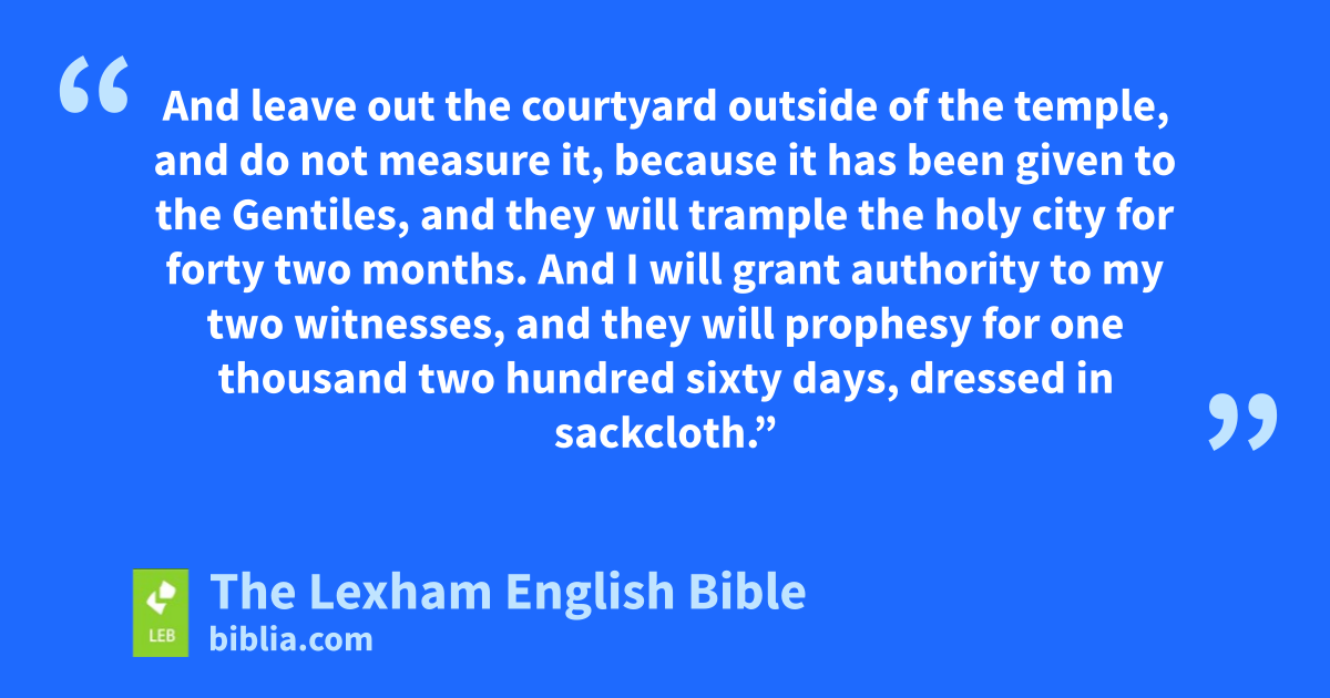 11 And a measuring rod similar in appearance to a staff was given to me, saying, “Get up and measure the temple of God and the altar and those who worship in it. 2 And leave out the courtyard outside of the temple, and do not measure it, because it has been given to the Gentiles, and they will trample the holy city for forty two months. 3 And I will grant authority* to my two witnesses, and they will prophesy for one thousand two hundred sixty days, dressed in sackcloth.” 4 These are the two olive trees and the two lampstands that stand before the Lord of the earth. 5 And if anyone wants to harm them, fire comes out of their mouth and consumes their enemies. And if anyone wants to harm them, in this way he must be killed. 6 These have the authority to shut the sky, so that ⌊it does not rain⌋a during the days of their prophecy. And they have authority over the waters, to turn them to blood, and to strike the earth with every plague as often as they wish.
