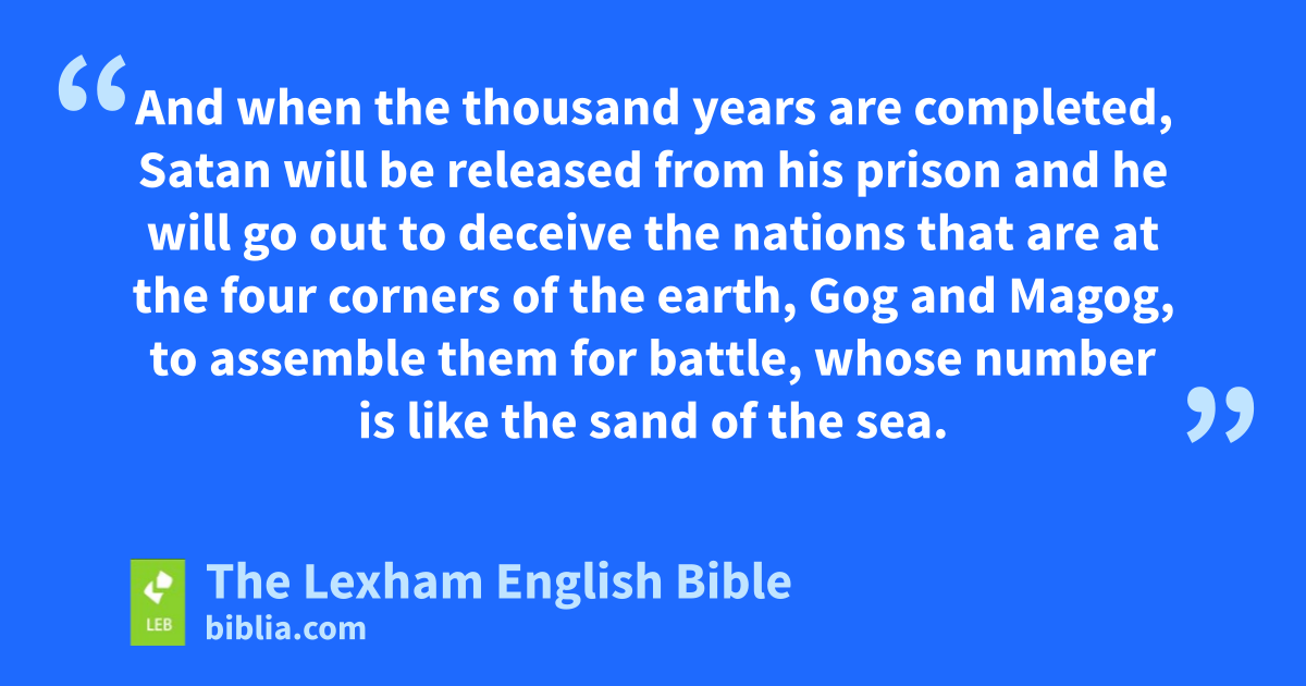 7 And when the thousand years are completed, Satan will be released from his prison 8 and he will go out to deceive the nations that are at the four corners of the earth, Gog and Magog, to assemble them for battle, ⌊whose number⌋b is like the sand of the sea. 9 And they went up on the broad plain of the earth and surrounded the fortified camp of the saints and the beloved city, and fire came down from heaven and consumed them. 10 And the devil who deceived them was thrown into the lake of fire and sulphur, where the beast and the false prophet also are, and they will be tormented day and night ⌊forever and ever⌋c.