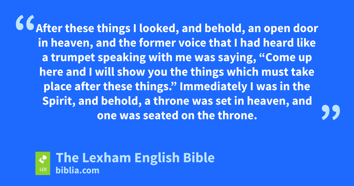 4 After these things I looked, and behold, an open door in heaven, and the former voice that I had heard like a trumpet speaking with me was saying, “Come up here and I will show you the things which must take place after these things.” 2 Immediately I was in the Spirit, and behold, a throne was set in heaven, and one was seated on the throne. 3 And the one seated was similar in appearance to jasper and carnelian stone, and a rainbow was around the throne similar in appearance to emerald. 4 And around the throne were twenty-four thrones, and seated on the thrones were twenty-four elders dressed in white clothing, and on their heads were gold crowns. 5 And from the throne came out lightnings and sounds and thunders, and seven torches of fire were burning before the throne, which are the seven spirits of God. 6 And before the throne was something like a sea of glass, like crystal, and in the midst of the throne and around the throne were four living creatures full of eyes in front and in back. 7 And the first living creature was similar to a lion, and the second living creature was similar to an ox, and the third living creature had a face like a man’s, and the fourth living creature was similar to an eagle flying. 8 And the four living creatures, ⌊each one⌋a of them, had six wings apiece, full of eyes around and inside, and they do not have rest day and night, saying,