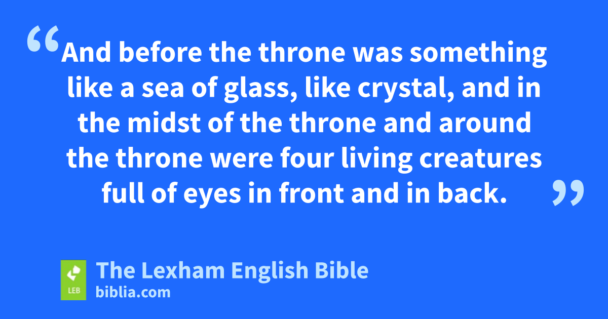 4 After these things I looked, and behold, an open door in heaven, and the former voice that I had heard like a trumpet speaking with me was saying, “Come up here and I will show you the things which must take place after these things.” 2 Immediately I was in the Spirit, and behold, a throne was set in heaven, and one was seated on the throne. 3 And the one seated was similar in appearance to jasper and carnelian stone, and a rainbow was around the throne similar in appearance to emerald. 4 And around the throne were twenty-four thrones, and seated on the thrones were twenty-four elders dressed in white clothing, and on their heads were gold crowns. 5 And from the throne came out lightnings and sounds and thunders, and seven torches of fire were burning before the throne, which are the seven spirits of God. 6 And before the throne was something like a sea of glass, like crystal, and in the midst of the throne and around the throne were four living creatures full of eyes in front and in back. 7 And the first living creature was similar to a lion, and the second living creature was similar to an ox, and the third living creature had a face like a man’s, and the fourth living creature was similar to an eagle flying. 8 And the four living creatures, ⌊each one⌋a of them, had six wings apiece, full of eyes around and inside, and they do not have rest day and night, saying,