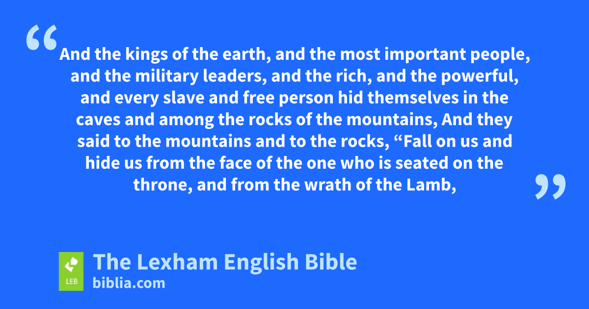 12 And I watched when he opened the sixth seal, and a great earthquake took place, and the sun became black like sackcloth made of hair, and the whole moon became like blood, 13 and the stars of heavenc fell to the earth like a fig tree throws down its unripe figs when* shaken by a great wind. 14 And the sky was split apart like a scroll that is rolled up, and every mountain and island were moved from their place. 15 And the kings of the earth, and the most important people, and the military leaders, and the rich, and the powerful, and every slave and free person hid themselves in the caves and among the rocks of the mountains, 16 And they said to the mountains and to the rocks, “Fall on us and hide us from the face of the one who is seated on the throne, and from the wrath of the Lamb, 17 because the great day of their wrath has come, and who is able to stand?”