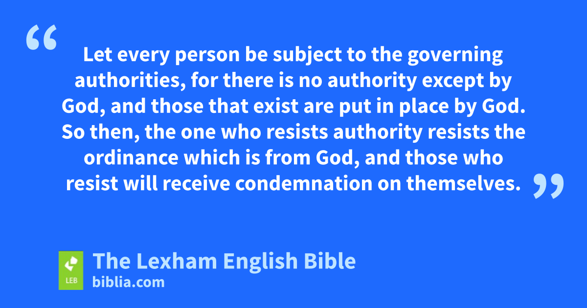 13 Let every person be subject to the governing authorities, for there is no authority except by God, and those that exist are put in place by God. 2 So then, the one who resists authority resists the ordinance which is from God, and those who resist will receive condemnation on themselves. 3 For rulers are not a cause of terror for a good deed, but for bad conduct. So do you want not to be afraid of authority? Do what is good, and you will have praise from it, 4 for it is God’s servant to you for what is good. But if you do what is bad, be afraid, because it does not bear the sword to no purpose. For it is God’s servant, the one who avenges for punishment on the one who does what is bad. 5 Therefore it is necessary to be in subjection, not only because of wrath but also because of conscience. 6 For because of this you also pay taxes, for the authoritiesa are servants of God, busily engaged in this very thing. 7 Pay to everyone what is owed: pay taxes to whom taxes are due; pay customs duties to whom customs duties are due; pay respect to whom respect is due; pay honor to whom honor is due.b