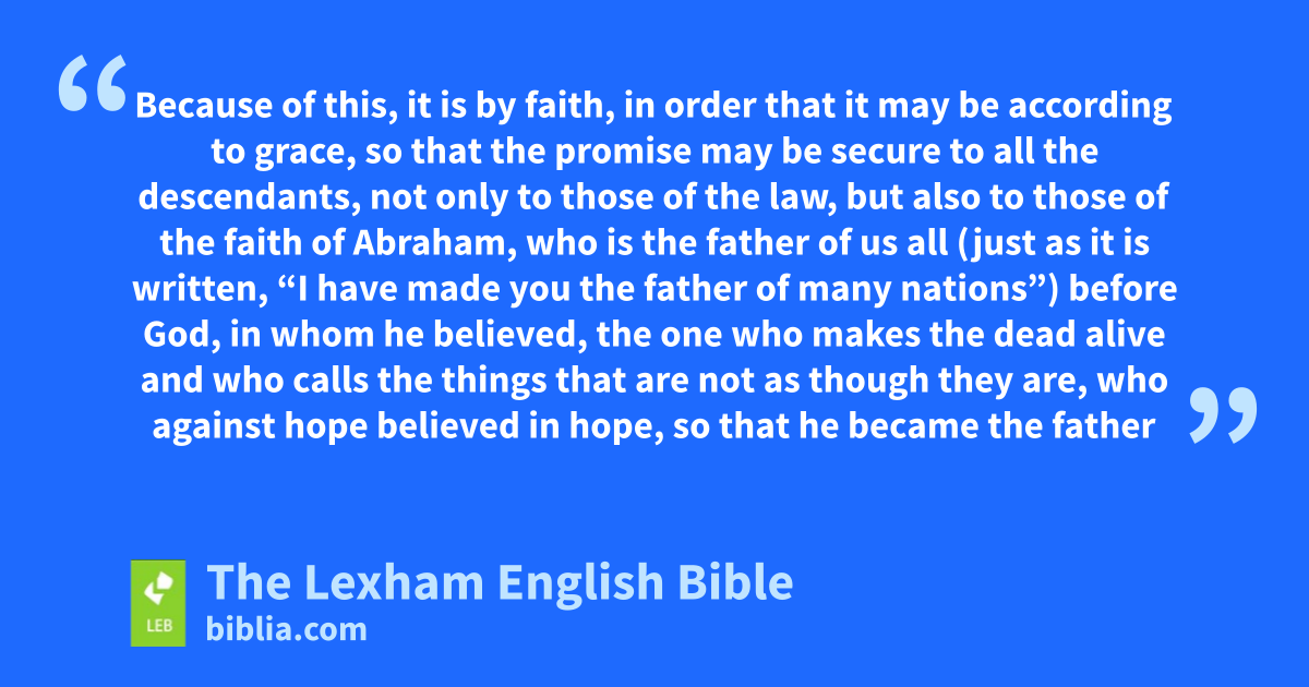 13 For the promise to Abraham or to his descendants, that he would be heir of the world, was not through the law, but through the righteousness by faith. 14 For if those of the law are heirs, faith is rendered void and the promise is nullified. 15 For the law produces wrath, but where there is no law, neither is there transgression. 16 Because of this, it is by faith, in order that it may be according to grace, so that the promise may be secure to all the descendants, not only to those of the law, but also to those of the faith of Abraham, who is the father of us all 17 (just as it is written, “I have made you the father of many nations”)p before God, in whom he believed, the one who makes the dead alive and who calls the things that are not as though they are, 18 who against hope believed in hope, so that he became the father of many nations, according to what was said, “so will your descendants be.”q 19 And not being weak in faith, he considered his own body as good as dead, r because he* was approximately a hundred years old, and the deadness of Sarah’s womb. 20 And he did not waver in unbelief at the promise of God, but was strengthened in faith, giving glory to God 21 and being fully convinced that what he had promised, he was also able to do. 22 Therefores it was credited to him for righteousness. 23 But it was not written for the sake of him alone that it was credited to him, 24 but also for the sake of us to whom it is going to be credited, to those who believe in the one who raised Jesus our Lord from the dead, 25 who was handed over on account of our trespasses, and was raised up in the interest of our justification.t