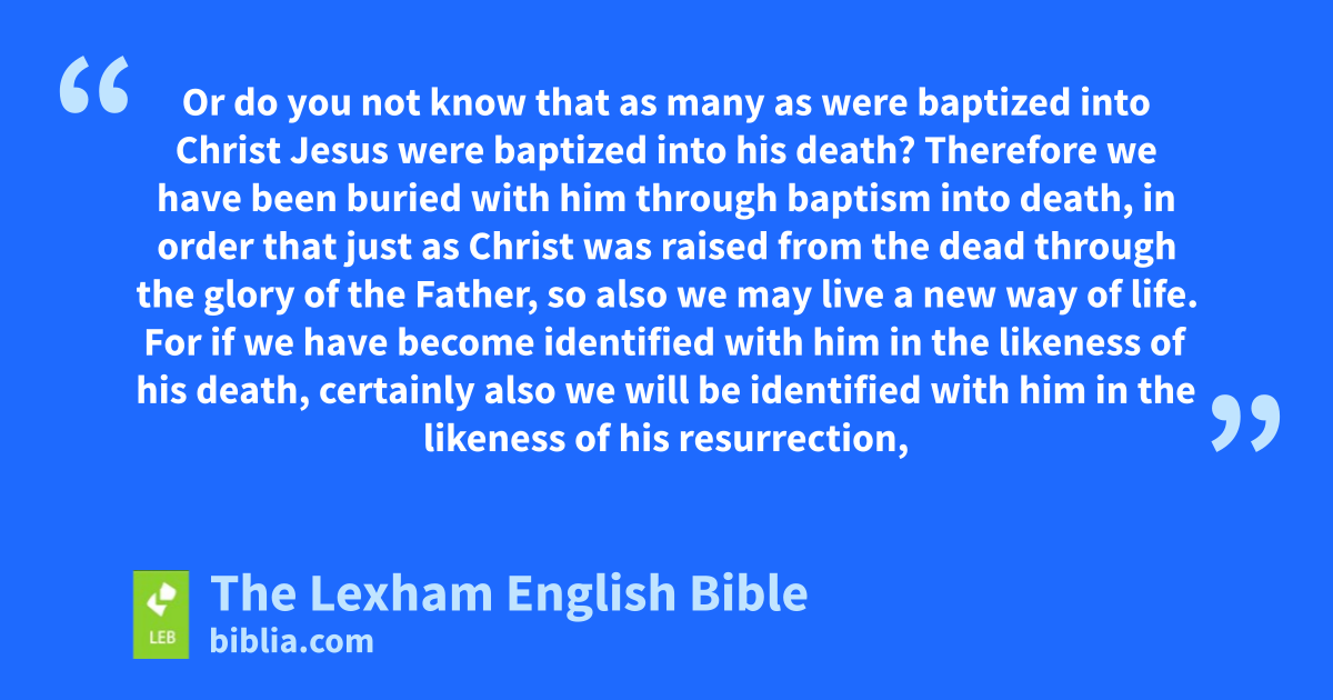 6 What therefore shall we say? Shall we continue in sin, in order that grace may increase? 2 May it never be! How can we who died to sin still live in it? 3 Or do you not know that as many as were baptized into Christ Jesus were baptized into his death? 4 Therefore we have been buried with him through baptism into death, in order that just as Christ was raised from the dead through the glory of the Father, so also we may live ⌊a new way of life⌋a. 5 For if we have become identified with him in the likeness of his death, certainly also we will be identified with him in the likenessb of his resurrection, 6 knowing this, that our old man was crucified together with him, in order that the body of sin may be done away with, that we may no longer be enslaved to sin. 7 For the one who has died has been freed from sin.