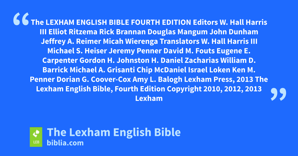 Lexham is a registered trademark of Logos Bible Software. You may use LEB or Lexham English Bible to refer to the Lexham English Bible, but may not use the Lexham trademark as any part of the name of a larger work quoting or containing it.