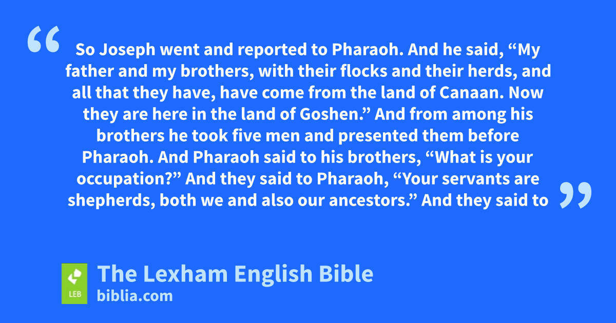 47 So Joseph went and reported to Pharaoh. And he said, “My father and my brothers, with their flocks and their herds, and all that they have, have come from the land of Canaan. Now they are here in the land of Goshen.” 2 And from among his brothers he took five men and presented them before Pharaoh. 3 And Pharaoh said to his brothers, “What is your occupation?” And they said to Pharaoh, “Your servants are ⌊shepherds⌋,a both we and also our ancestors.”b 4 And they said to Pharaoh, “We have come to sojourn in the land, for there is no pasture for your servant’s flocks, for the famine is severe in the land of Canaan. So now, please let your servants dwell in the land of Goshen.” 5 Then Pharaoh said to Joseph, “Your father and your brothers have come to you. 6 The land of Egypt is before you. Settle your father and your brothers in the best of the land. Let them live in the land of Goshen, and if you know there are among them men of ability, then appoint them overseers of my own livestock.” 7 Then Joseph brought his father Jacob and presented him before Pharaoh. And Jacob blessed Pharaoh. 8 Then Pharaoh said to Jacob, “⌊How old are you⌋?”c 9 And Jacob said to Pharaoh, “The days of the years of my sojourning are one hundred and thirty years. Few and hard have been the days of the years of my life, and they have not reached the days of the years of the lives of my ancestorsd in the days of their sojourning.” 10 And Jacob blessed Pharaoh, and he went out from the presence of Pharaoh. 11 And Joseph settled his father and his brothers, and he gave them property in the land of Egypt in the best part of the land, in the land of Rameses, as Pharaoh had instructed. 12 And Joseph provided his father and his brothers and all the household of his father with food, according to the number of their children.
