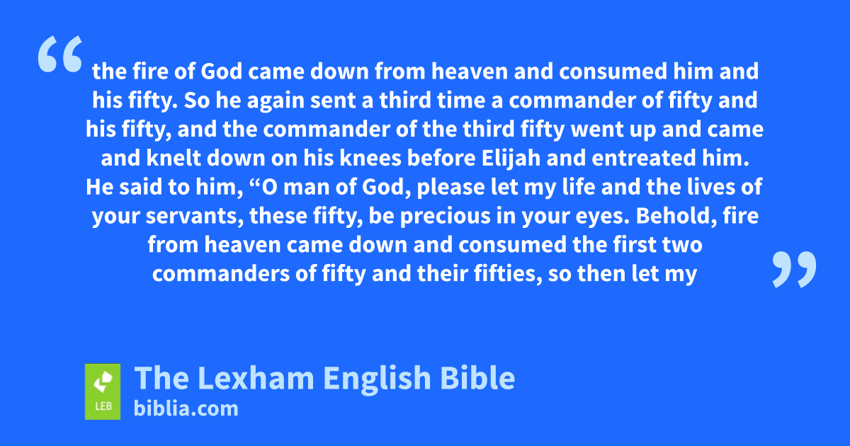 11 So he ⌊again sent⌋c another commander of fifty and his fifty men. He answered and said to him, “O man of God, thus says the king, ‘Come down quickly!’ ” 12 Then Elijah answered and said to them, “If I am a man of God, then let fire come down from heaven and consume you and your fifty!” Then the fire of God came down from heaven and consumed him and his fifty.