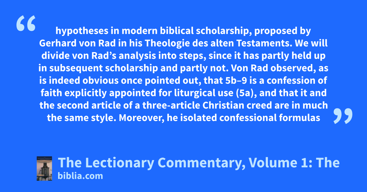 hypotheses in modern biblical scholarship, proposed by Gerhard von Rad in his Theologie des alten Testaments. We will divide von Rad’s analysis into steps, since it has partly held up in subsequent scholarship and partly not. Von Rad observed, as is indeed obvious once pointed out, that 5b–9 is a confession of faith explicitly appointed for liturgical use (5a), and that it and the second article of a three-article Christian creed are in much the same style. Moreover, he isolated confessional formulas