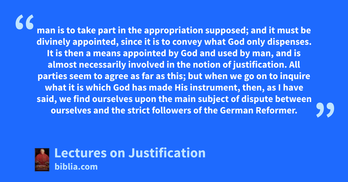 man is to take part in the appropriation supposed; and it must be divinely appointed, since it is to convey what God only dispenses. It is then a means appointed by God and used by man, and is almost necessarily involved in the notion of justification. All parties seem to agree as far as this; but when we go on to inquire what it is which God has made His instrument, then, as I have said, we find ourselves upon the main subject of dispute between ourselves and the strict followers of the German Reformer.