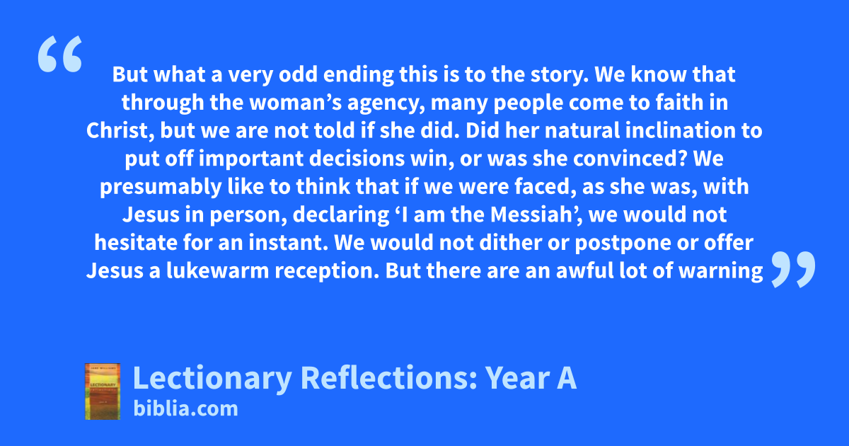 But what a very odd ending this is to the story. We know that through the woman’s agency, many people come to faith in Christ, but we are not told if she did. Did her natural inclination to put off important decisions win, or was she convinced? We presumably like to think that if we were faced, as she was, with Jesus in person, declaring ‘I am the Messiah’, we would not hesitate for an instant. We would not dither or postpone or offer Jesus a lukewarm reception. But there are an awful lot of warning