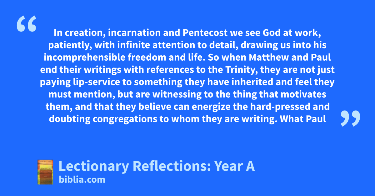 In creation, incarnation and Pentecost we see God at work, patiently, with infinite attention to detail, drawing us into his incomprehensible freedom and life. So when Matthew and Paul end their writings with references to the Trinity, they are not just paying lip-service to something they have inherited and feel they must mention, but are witnessing to the thing that motivates them, and that they believe can energize the hard-pressed and doubting congregations to whom they are writing. What Paul
