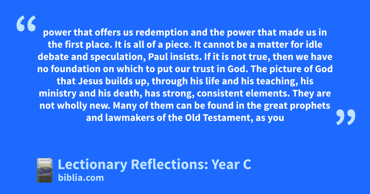 power that offers us redemption and the power that made us in the first place. It is all of a piece. It cannot be a matter for idle debate and speculation, Paul insists. If it is not true, then we have no foundation on which to put our trust in God. The picture of God that Jesus builds up, through his life and his teaching, his ministry and his death, has strong, consistent elements. They are not wholly new. Many of them can be found in the great prophets and lawmakers of the Old Testament, as you