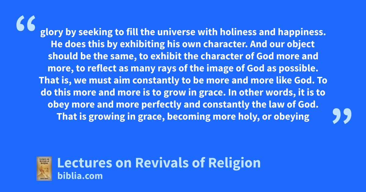 glory by seeking to fill the universe with holiness and happiness. He does this by exhibiting his own character. And our object should be the same, to exhibit the character of God more and more, to reflect as many rays of the image of God as possible. That is, we must aim constantly to be more and more like God. To do this more and more is to grow in grace. In other words, it is to obey more and more perfectly and constantly the law of God. That is growing in grace, becoming more holy, or obeying