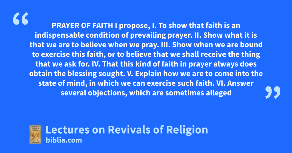 PRAYER OF FAITH I propose, I. To show that faith is an indispensable condition of prevailing prayer. II. Show what it is that we are to believe when we pray. III. Show when we are bound to exercise this faith, or to believe that we shall receive the thing that we ask for. IV. That this kind of faith in prayer always does obtain the blessing sought. V. Explain how we are to come into the state of mind, in which we can exercise such faith. VI. Answer several objections, which are sometimes alleged
