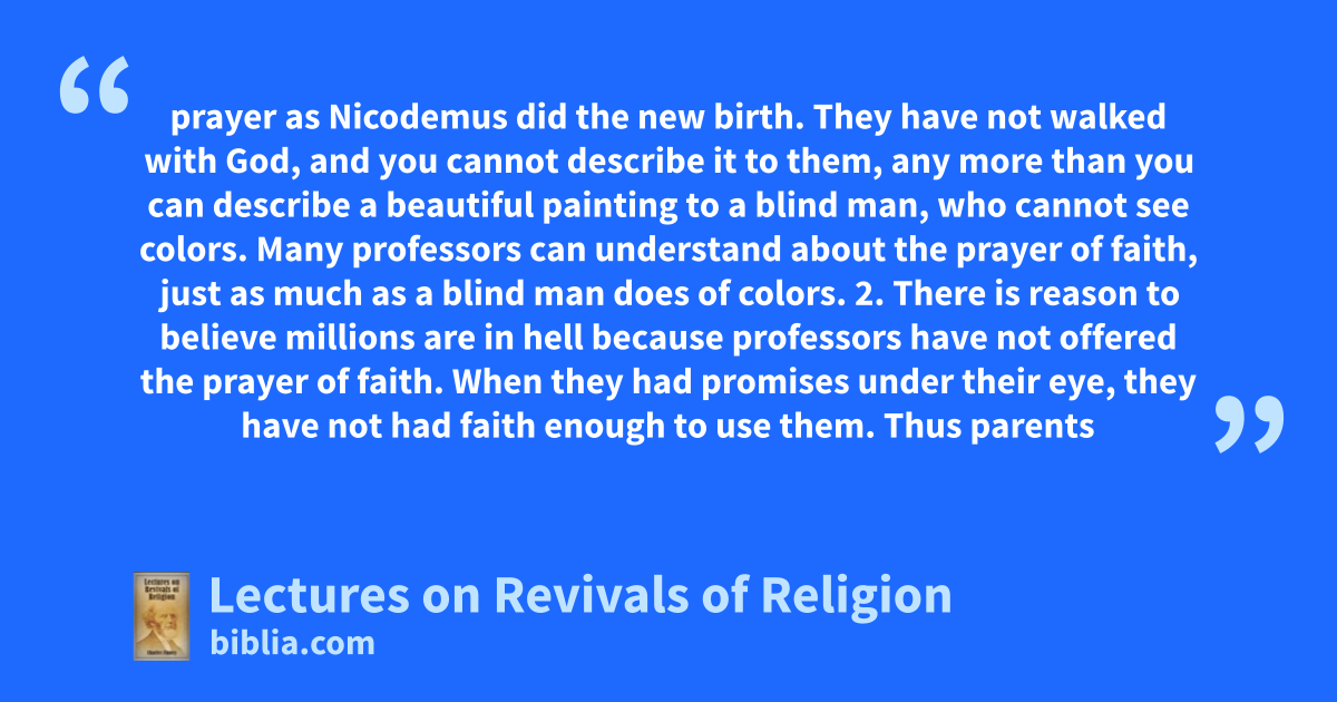 prayer as Nicodemus did the new birth. They have not walked with God, and you cannot describe it to them, any more than you can describe a beautiful painting to a blind man, who cannot see colors. Many professors can understand about the prayer of faith, just as much as a blind man does of colors. 2. There is reason to believe millions are in hell because professors have not offered the prayer of faith. When they had promises under their eye, they have not had faith enough to use them. Thus parents