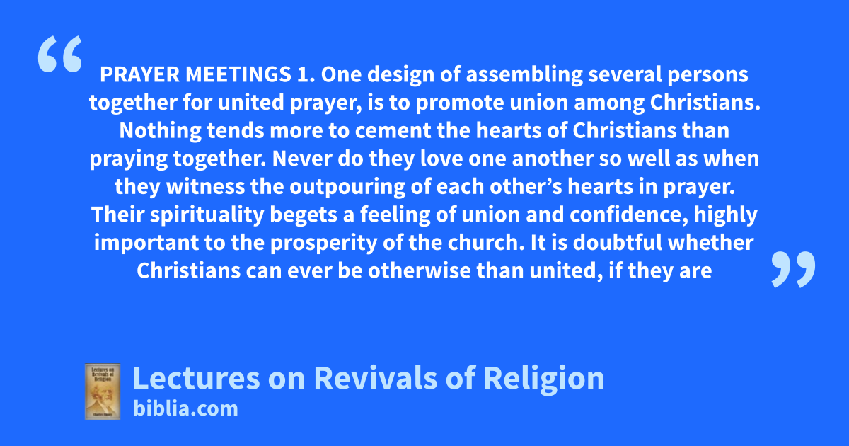 PRAYER MEETINGS 1. One design of assembling several persons together for united prayer, is to promote union among Christians. Nothing tends more to cement the hearts of Christians than praying together. Never do they love one another so well as when they witness the outpouring of each other’s hearts in prayer. Their spirituality begets a feeling of union and confidence, highly important to the prosperity of the church. It is doubtful whether Christians can ever be otherwise than united, if they are