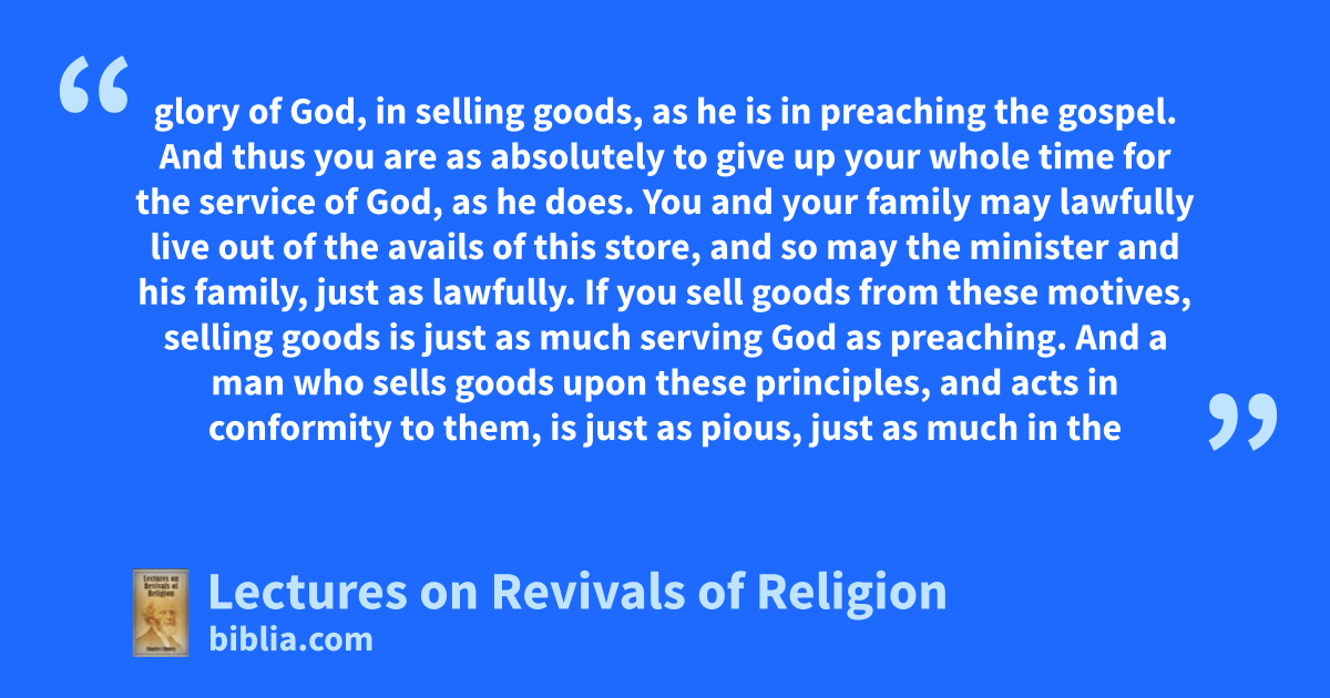 glory of God, in selling goods, as he is in preaching the gospel. And thus you are as absolutely to give up your whole time for the service of God, as he does. You and your family may lawfully live out of the avails of this store, and so may the minister and his family, just as lawfully. If you sell goods from these motives, selling goods is just as much serving God as preaching. And a man who sells goods upon these principles, and acts in conformity to them, is just as pious, just as much in the