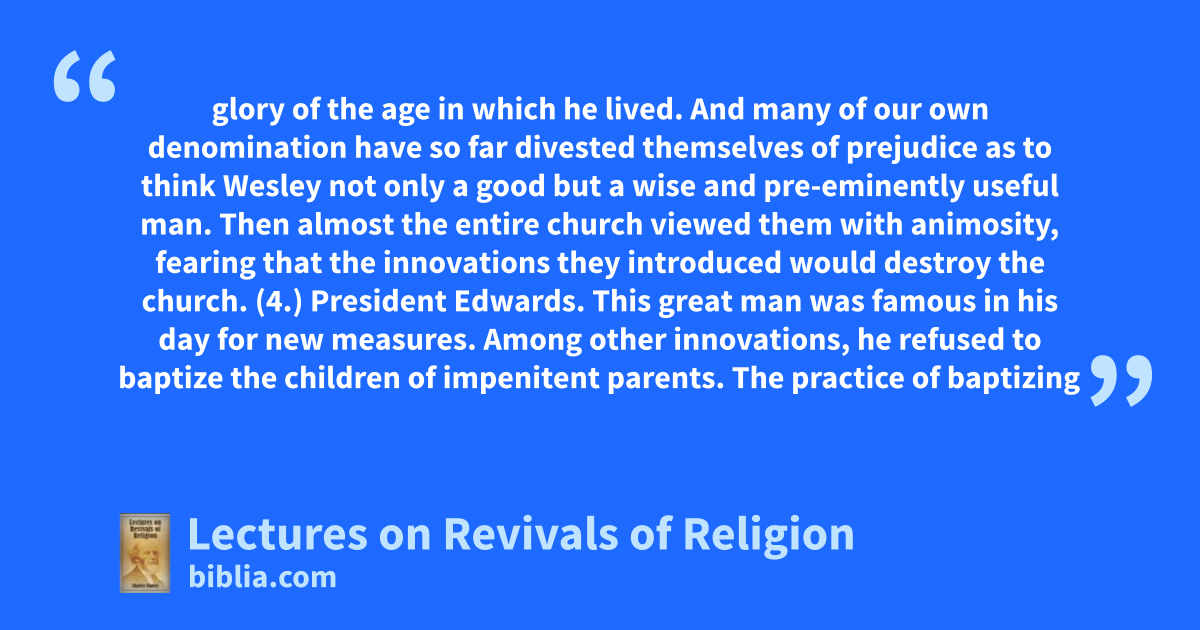 glory of the age in which he lived. And many of our own denomination have so far divested themselves of prejudice as to think Wesley not only a good but a wise and pre-eminently useful man. Then almost the entire church viewed them with animosity, fearing that the innovations they introduced would destroy the church. (4.) President Edwards. This great man was famous in his day for new measures. Among other innovations, he refused to baptize the children of impenitent parents. The practice of baptizing