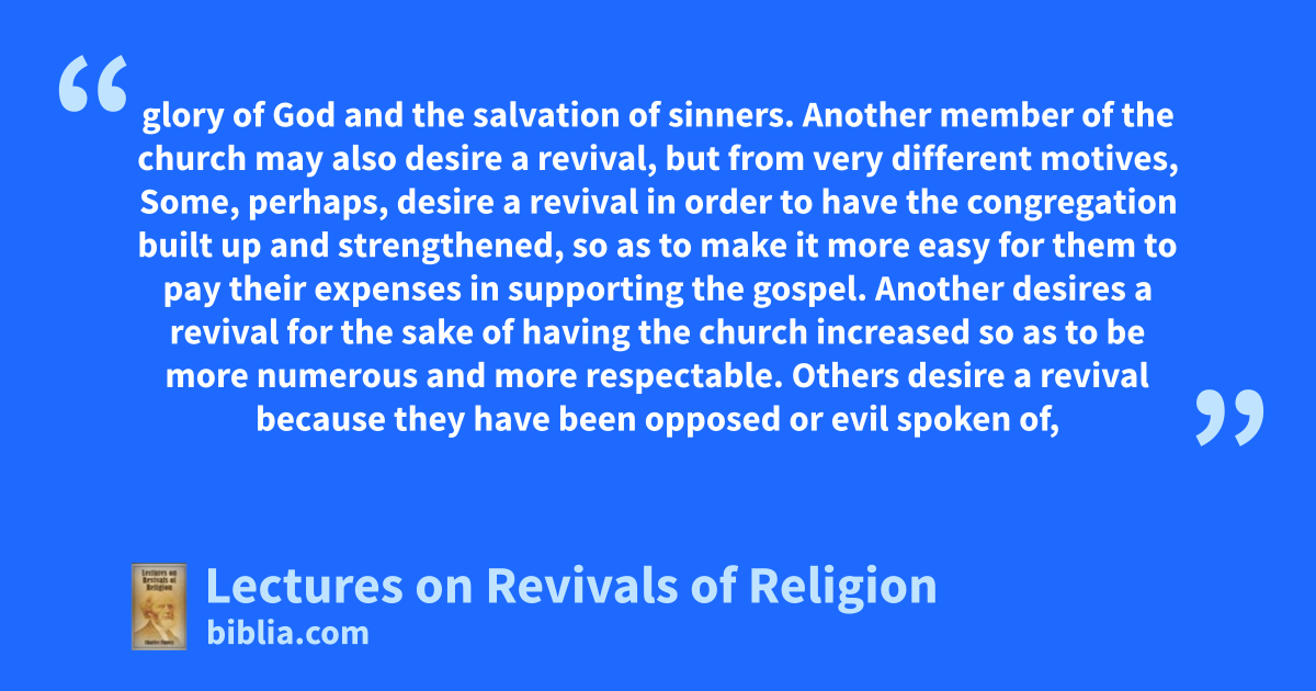 glory of God and the salvation of sinners. Another member of the church may also desire a revival, but from very different motives, Some, perhaps, desire a revival in order to have the congregation built up and strengthened, so as to make it more easy for them to pay their expenses in supporting the gospel. Another desires a revival for the sake of having the church increased so as to be more numerous and more respectable. Others desire a revival because they have been opposed or evil spoken of,