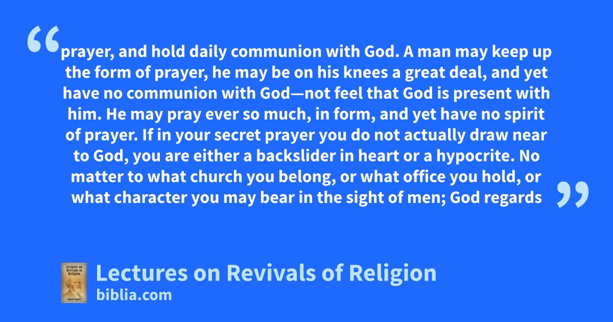 prayer, and hold daily communion with God. A man may keep up the form of prayer, he may be on his knees a great deal, and yet have no communion with God—not feel that God is present with him. He may pray ever so much, in form, and yet have no spirit of prayer. If in your secret prayer you do not actually draw near to God, you are either a backslider in heart or a hypocrite. No matter to what church you belong, or what office you hold, or what character you may bear in the sight of men; God regards