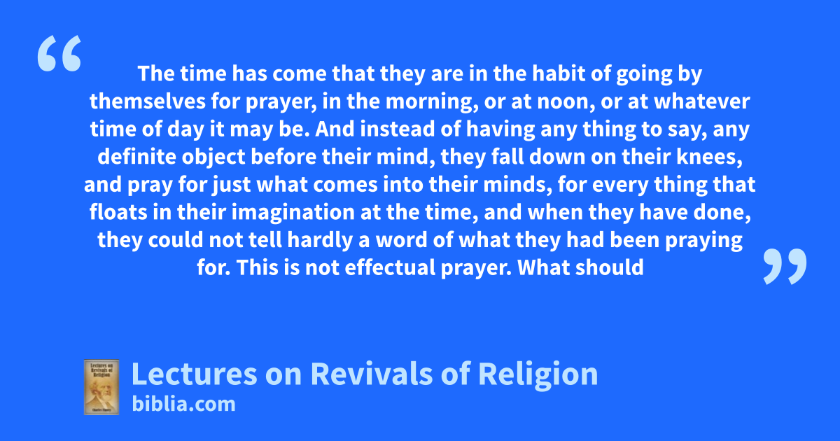 The time has come that they are in the habit of going by themselves for prayer, in the morning, or at noon, or at whatever time of day it may be. And instead of having any thing to say, any definite object before their mind, they fall down on their knees, and pray for just what comes into their minds, for every thing that floats in their imagination at the time, and when they have done, they could not tell hardly a word of what they had been praying for. This is not effectual prayer. What should