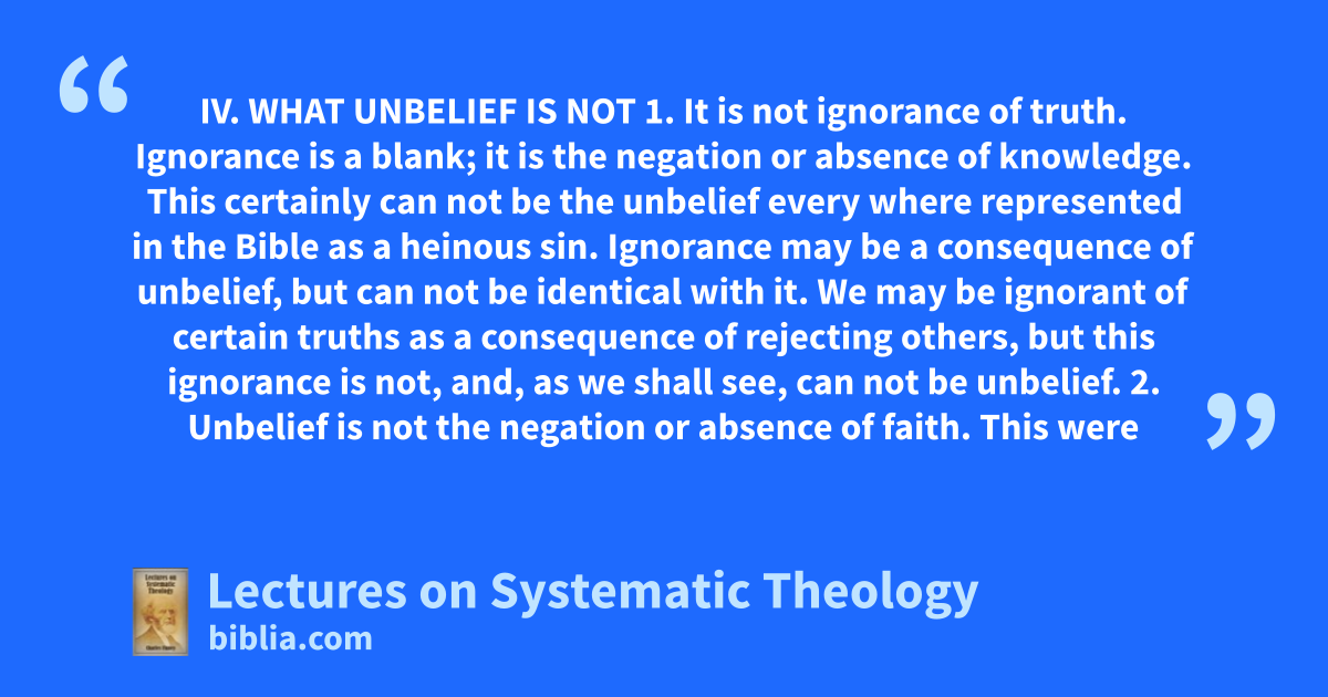 IV. WHAT UNBELIEF IS NOT 1. It is not ignorance of truth. Ignorance is a blank; it is the negation or absence of knowledge. This certainly can not be the unbelief every where represented in the Bible as a heinous sin. Ignorance may be a consequence of unbelief, but can not be identical with it. We may be ignorant of certain truths as a consequence of rejecting others, but this ignorance is not, and, as we shall see, can not be unbelief. 2. Unbelief is not the negation or absence of faith. This were