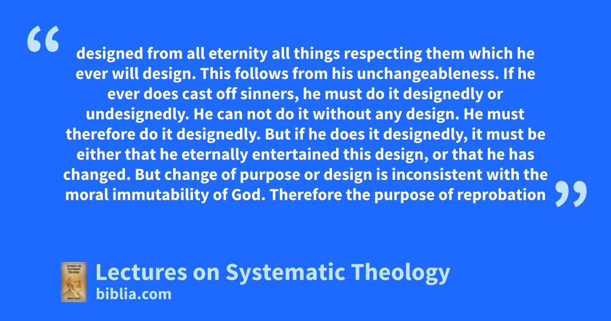 designed from all eternity all things respecting them which he ever will design. This follows from his unchangeableness. If he ever does cast off sinners, he must do it designedly or undesignedly. He can not do it without any design. He must therefore do it designedly. But if he does it designedly, it must be either that he eternally entertained this design, or that he has changed. But change of purpose or design is inconsistent with the moral immutability of God. Therefore the purpose of reprobation