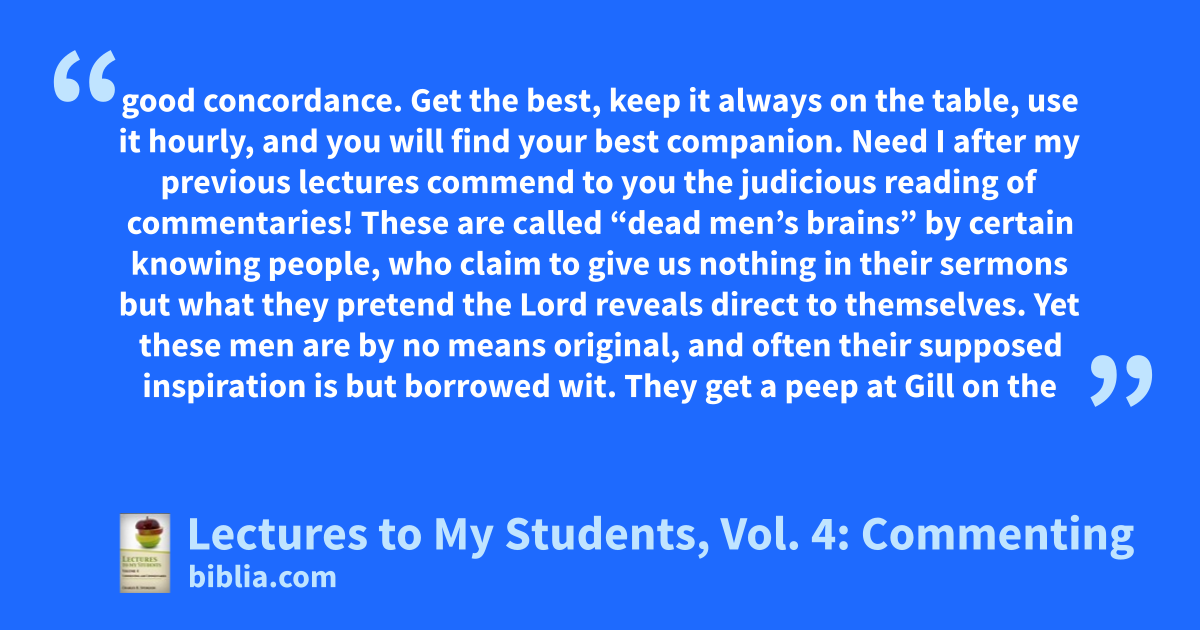 good concordance. Get the best, keep it always on the table, use it hourly, and you will find your best companion. Need I after my previous lectures commend to you the judicious reading of commentaries! These are called “dead men’s brains” by certain knowing people, who claim to give us nothing in their sermons but what they pretend the Lord reveals direct to themselves. Yet these men are by no means original, and often their supposed inspiration is but borrowed wit. They get a peep at Gill on the