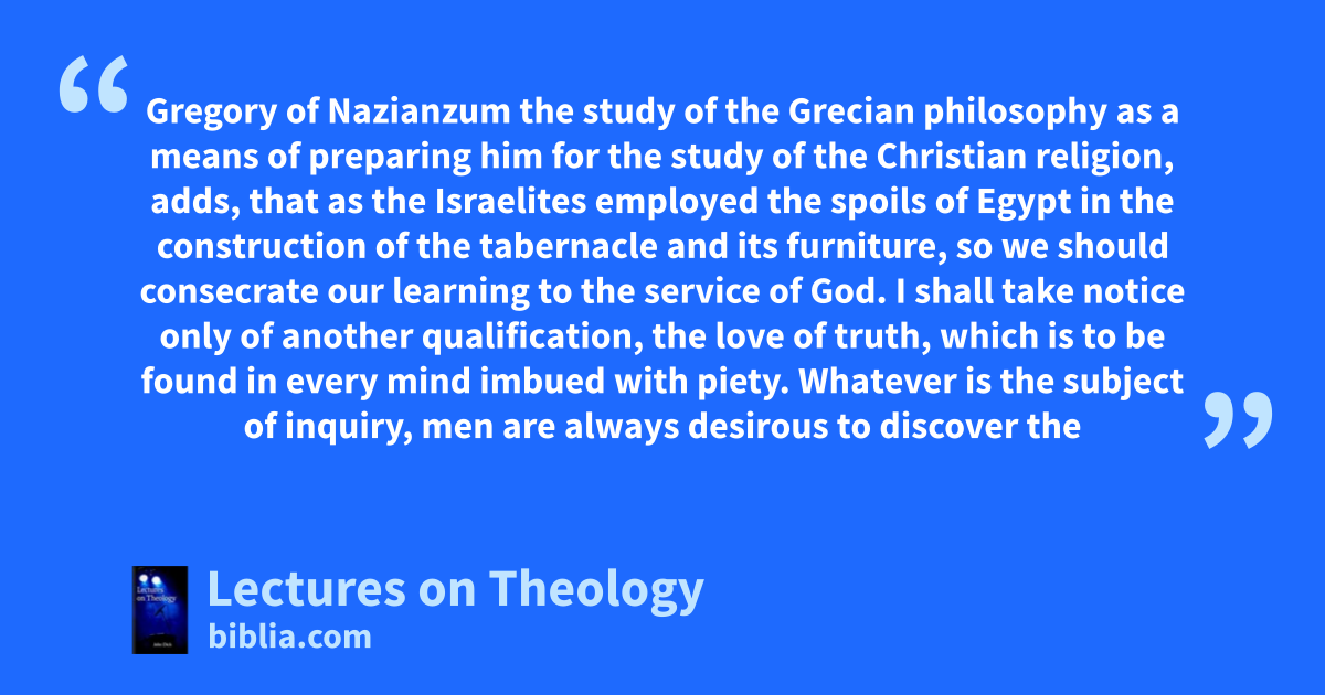 Gregory of Nazianzum the study of the Grecian philosophy as a means of preparing him for the study of the Christian religion, adds, that as the Israelites employed the spoils of Egypt in the construction of the tabernacle and its furniture, so we should consecrate our learning to the service of God. I shall take notice only of another qualification, the love of truth, which is to be found in every mind imbued with piety. Whatever is the subject of inquiry, men are always desirous to discover the