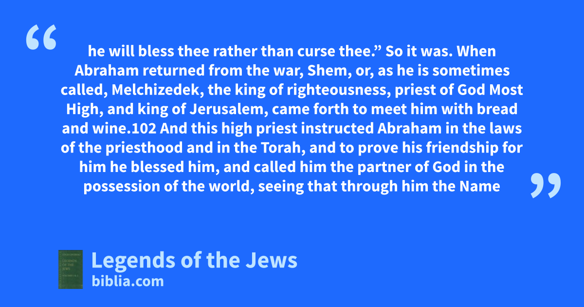 he will bless thee rather than curse thee.” So it was. When Abraham returned from the war, Shem, or, as he is sometimes called, Melchizedek, the king of righteousness, priest of God Most High, and king of Jerusalem, came forth to meet him with bread and wine.102 And this high priest instructed Abraham in the laws of the priesthood and in the Torah, and to prove his friendship for him he blessed him, and called him the partner of God in the possession of the world, seeing that through him the Name