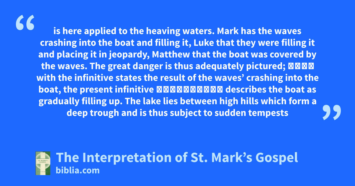 is here applied to the heaving waters. Mark has the waves crashing into the boat and filling it, Luke that they were filling it and placing it in jeopardy, Matthew that the boat was covered by the waves. The great danger is thus adequately pictured; ὥστε with the infinitive states the result of the waves’ crashing into the boat, the present infinitive γεμίξεσθαι describes the boat as gradually filling up. The lake lies between high hills which form a deep trough and is thus subject to sudden tempests