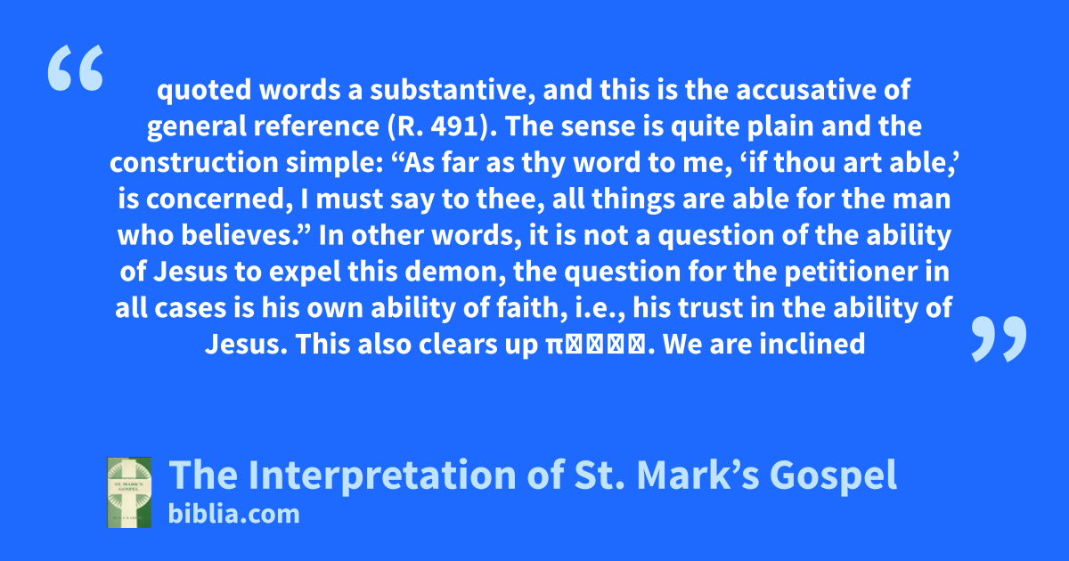 quoted words a substantive, and this is the accusative of general reference (R. 491). The sense is quite plain and the construction simple: “As far as thy word to me, ‘if thou art able,’ is concerned, I must say to thee, all things are able for the man who believes.” In other words, it is not a question of the ability of Jesus to expel this demon, the question for the petitioner in all cases is his own ability of faith, i.e., his trust in the ability of Jesus. This also clears up πάντα. We are inclined
