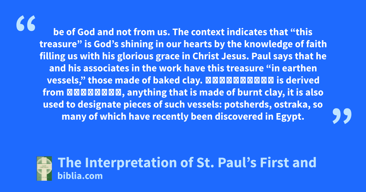 be of God and not from us. The context indicates that “this treasure” is God’s shining in our hearts by the knowledge of faith filling us with his glorious grace in Christ Jesus. Paul says that he and his associates in the work have this treasure “in earthen vessels,” those made of baked clay. Ὀστράκινος is derived from ὄστρακον, anything that is made of burnt clay, it is also used to designate pieces of such vessels: potsherds, ostraka, so many of which have recently been discovered in Egypt.