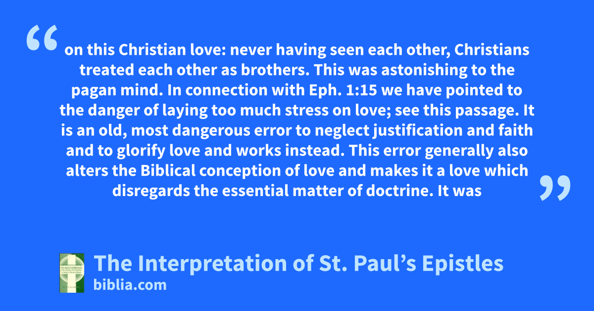 on this Christian love: never having seen each other, Christians treated each other as brothers. This was astonishing to the pagan mind. In connection with Eph. 1:15 we have pointed to the danger of laying too much stress on love; see this passage. It is an old, most dangerous error to neglect justification and faith and to glorify love and works instead. This error generally also alters the Biblical conception of love and makes it a love which disregards the essential matter of doctrine. It was